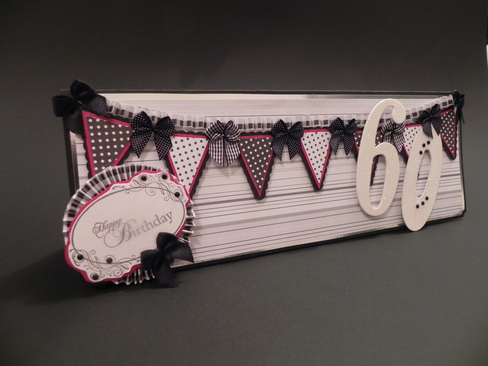My brother is 60 in a couple of days so this is the card I made for him.  The base cardstock is black, layered with silver mirror card, followed by a sheet of black & white striped paper from the Papermania 'Liquorice Sherbet' paper pack I was lucky enough to be find in my stocking this Christmas.  I've used some of the black & white spotted paper from the same pack on the banner pendants, which I cut using a banner punch from SU.  The base cardstock for each pendant was black, layered in red, then the spotted Papermania paper glued on top. The bows (also from the same range) filled the gaps between the pendants and finally, a stip of concertinered paper over the top to add a little more detail.