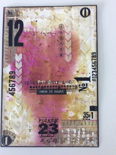 Because they are just scraps of card that I have either mopped up spare paint, ink or texture paste on or where I have practised a technique, played with a new stencil or product or just checked out out a particular colour or colour combo before doing it on my main project, there aren't any step-by-step process pictures for these posts I'm afraid...sorry.